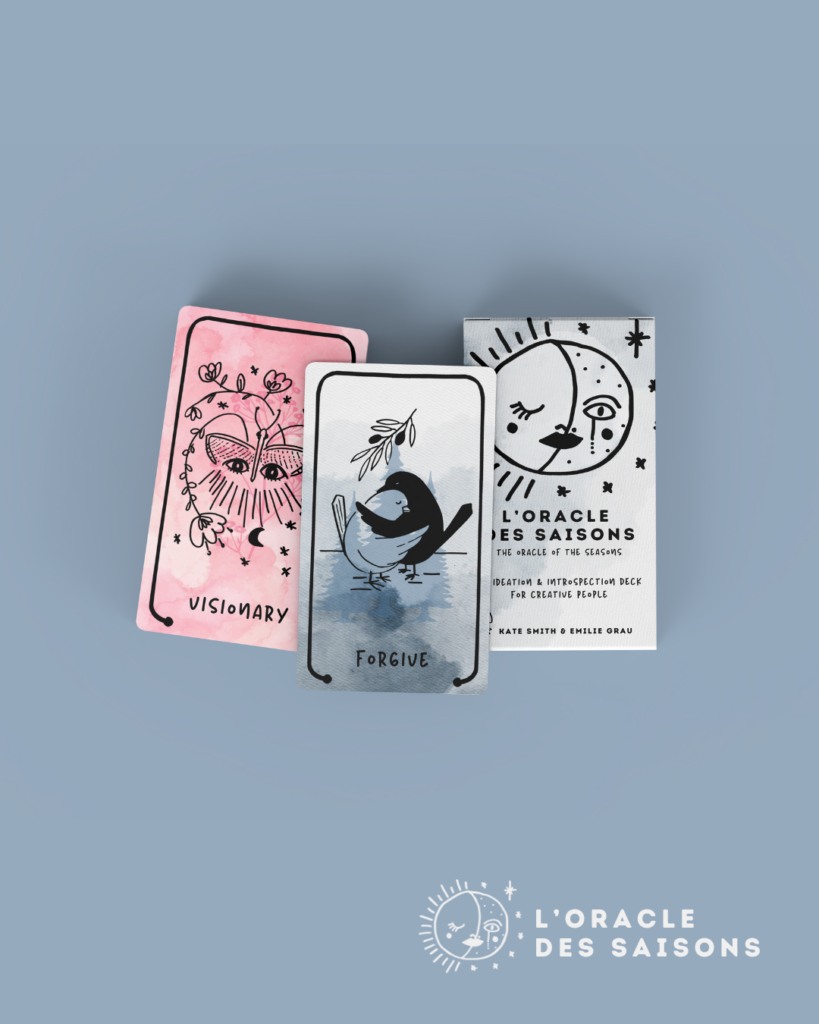 Cet oracle a été co-conçu et co-designé avec mon amie entrepreneure et artiste Kate Townley Smith. Notre intention était d’avoir un « joy project » en commun, créatif, ludique et entrepreneurial. Les cartes ont été dessinées à 4 mains, entre le Quercy Blanc (France) où je reside et les Bleu Ridge Mountians (Etats-Unis), où reside Kate.